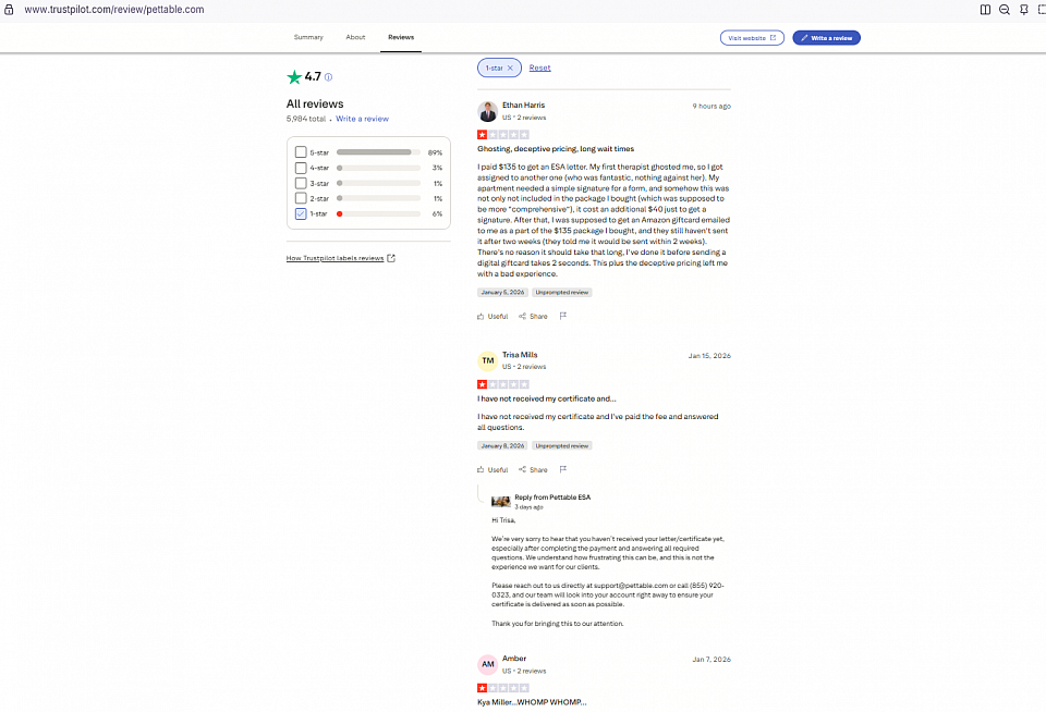 Based on my experience and the numerous negative reviews from verified users, Pettable.com is not a legitimate ESA service. Hidden fees, unprofessional staff, poor communication, and failure to deliver promised results make it risky and stressful to use.